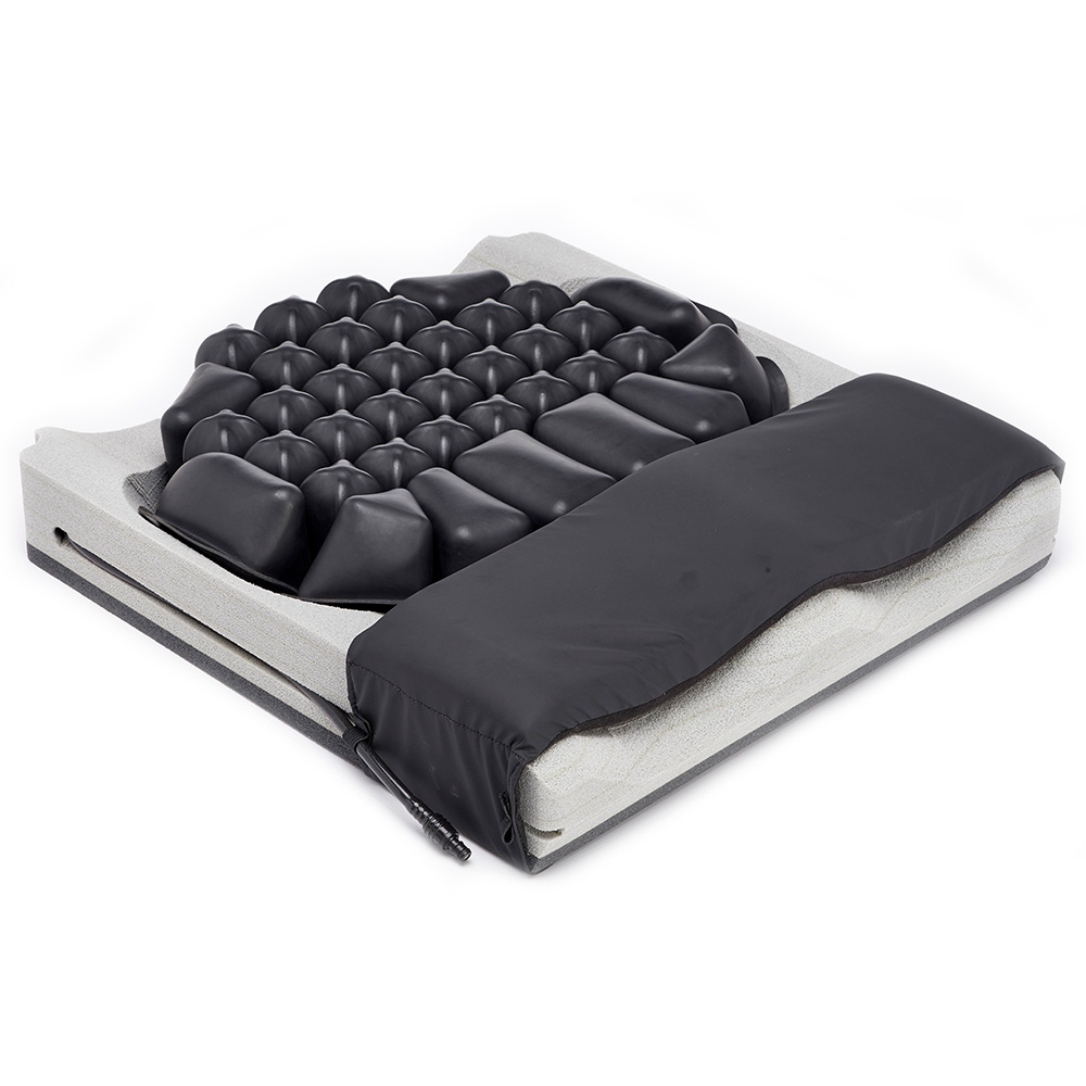 Base de goma espuma contorneada de polietileno con celdas de aire interconectadas de neoprene de 3” en zona sacra. Presenta insert de goma espuma de baja densidad en zona de muslos para mayor contacto y confort en el apoyo. Contiene una o dos válvulas de inflado. Posibilidad de ajustarse a las asimetrías pélvicas del paciente, a fin de proteger zonas específicas de tejido blando/piel y facilitar el posicionamiento presentando un mejor apoyo sobre muslos. Límite de peso: 225 kg. Incluye inflador, manual y kit de reparación.