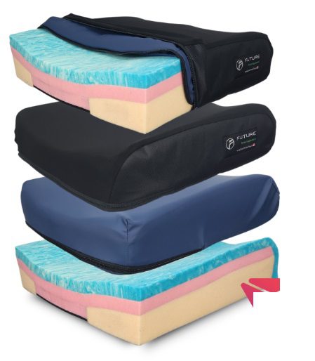 Almohadon semi híbrido antiescaras, espumas de tres densidades. Capa superior de espuma viscoelastica con gel. Hondonada pelvica y conformado en zona de muslos para alineación postural. Dos fundas con cierre incluídas: interior impermeable y exterior elástica en cuatro direcciones para reducir sizallamiento. Soporta pacientes hasta 114 kg.