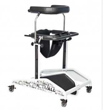 Andador anterior con estructura de aluminio con cuatro ruedas giratorias con freno. Barra perimetral para control de tronco superior acolchada con apertura posterior. Soporte de cadera ajustable en altura y profundidad con arnés pélvico. Apoyo antebraquial anatómico regulable en altura con toma anterior regulable en ancho, profundidad y rotación. Chiripá de 4 puntos. Control de tronco.