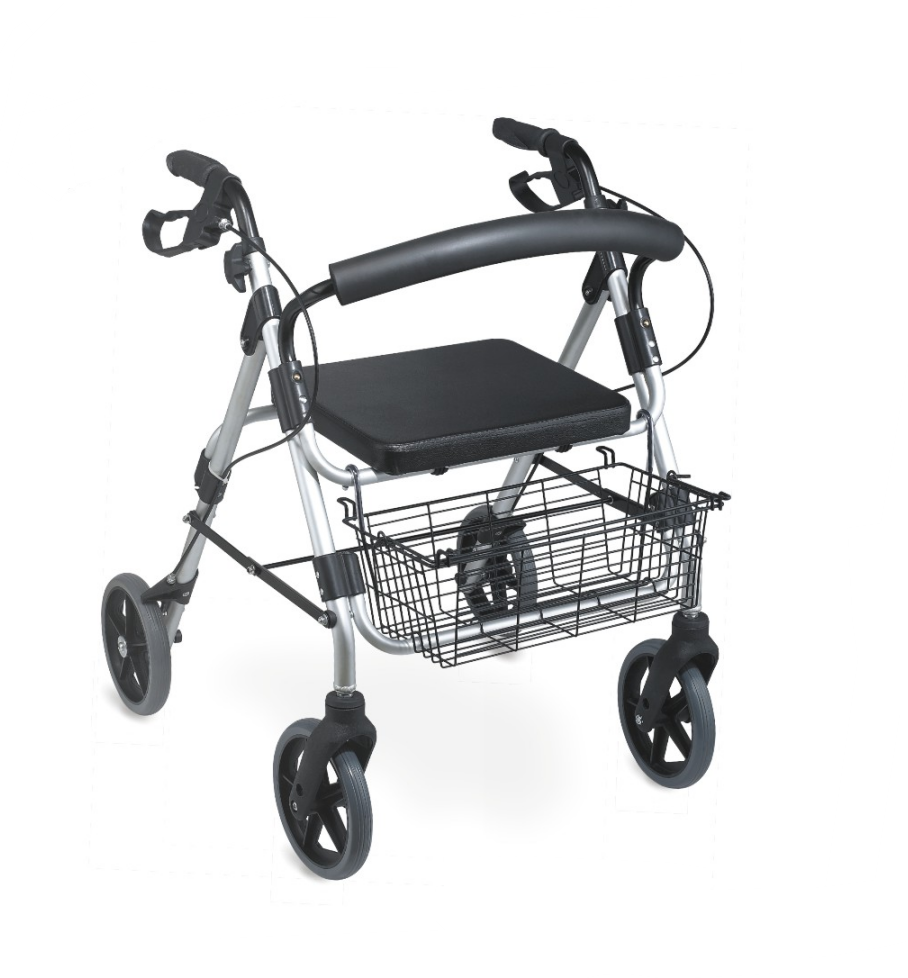 Andador Cuadro De Aluminio Ultraliviano Plegable. 4 Ruedas De 20 Cm. Respaldo Acolchado. Sistema De Plegado Con Una Mano. Altura Y Angulo De Empuñaduras Ajustable. Frenos En Empuñaduras. Canasto Metalico Soporta Hasta 5 Kg. Asiento. Soporta Pacientes Hasta 100 Kg.