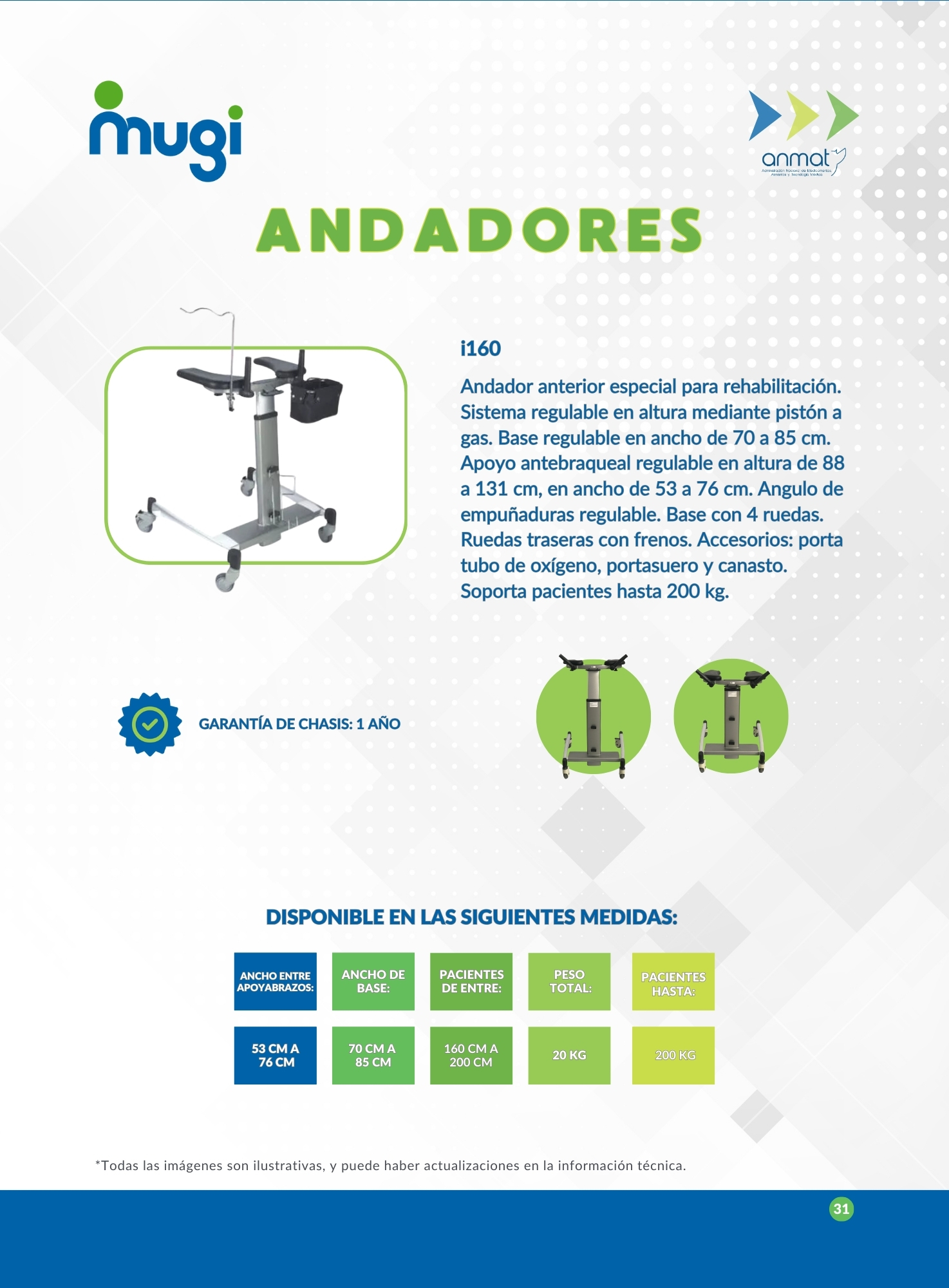 Andador Anterior Especial Para Rehabilitacion. Sistema Regulable En Altura Mediante Piston A Gas. Base Regulable En Ancho De 70 A 85 Cm. Apoyo Antebraqueal Regulable En Altura De 88 A 131 Cm, En Ancho De 53 A 76 Cm. Angulo De Empuñaduras Regulable. Base Con 4 Ruedas. Ruedas Traseras Con Frenos. Accesorios: Porta Tubo De Oxigeno, Portasuero Y Canasto. Soporta Pacientes Hasta 200 Kg.