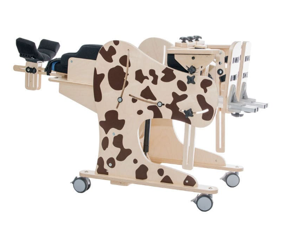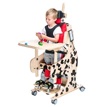 Silla para actividades múltiples con sistema de bipedestación. Fabricado en madera multilaminada. Función supina de 0° a 90°. Estructura realizada con materiales ecológicos. Cuatro ruedas de giro libre con freno. Apoya pies independientes, regulables en altura e inclinación de 90°. Apoya rodillas regulables en altura y profundidad. Asiento regulable en profundidad, respaldo con controles laterales regulables en ancho e inclinación. Apoya cabeza comformable regulable en altura, profundidad e inclinación . Mesa regulable en inclinación.