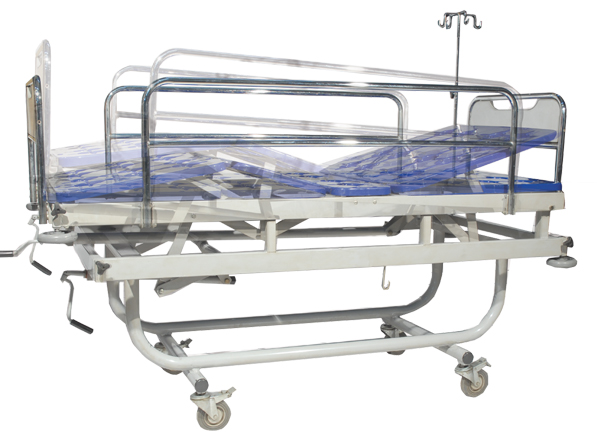 Chasis de acero esmaltado, lecho de chapa esmaltada, apto para masaje cardíaco, con tres movimientos manuales, y un tercer movimiento de pie a manivela (tredelenburg), esmaltada en pintura Epoxi, soporte porta sueros en sus cuatro extremos, con una porta suero de cuatro ganchos cromados, cuatro ruedas de giro libre con frenos de 125mm, cabera y barandas volcables de acero cromado, con ruedas para choques.