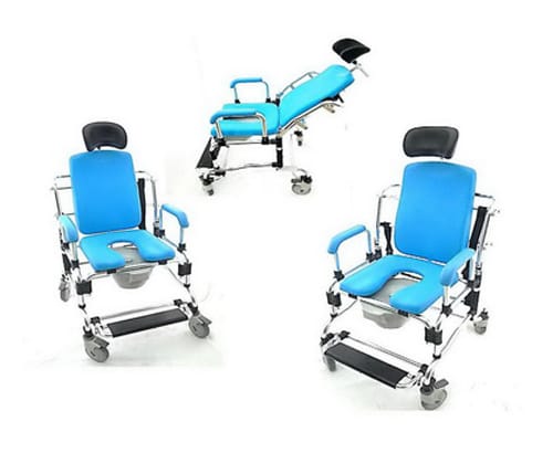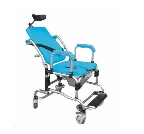 Silla de Baño de Doble Función, estructura de aluminio plegable.Respaldo reclinable en varias posiciones.Apoya cabeza regulable en altura, profundidad y ángulo.Ruedas para traslado con frenosApoya brazos desmontables.Asiento acolchado soft con recipiente.