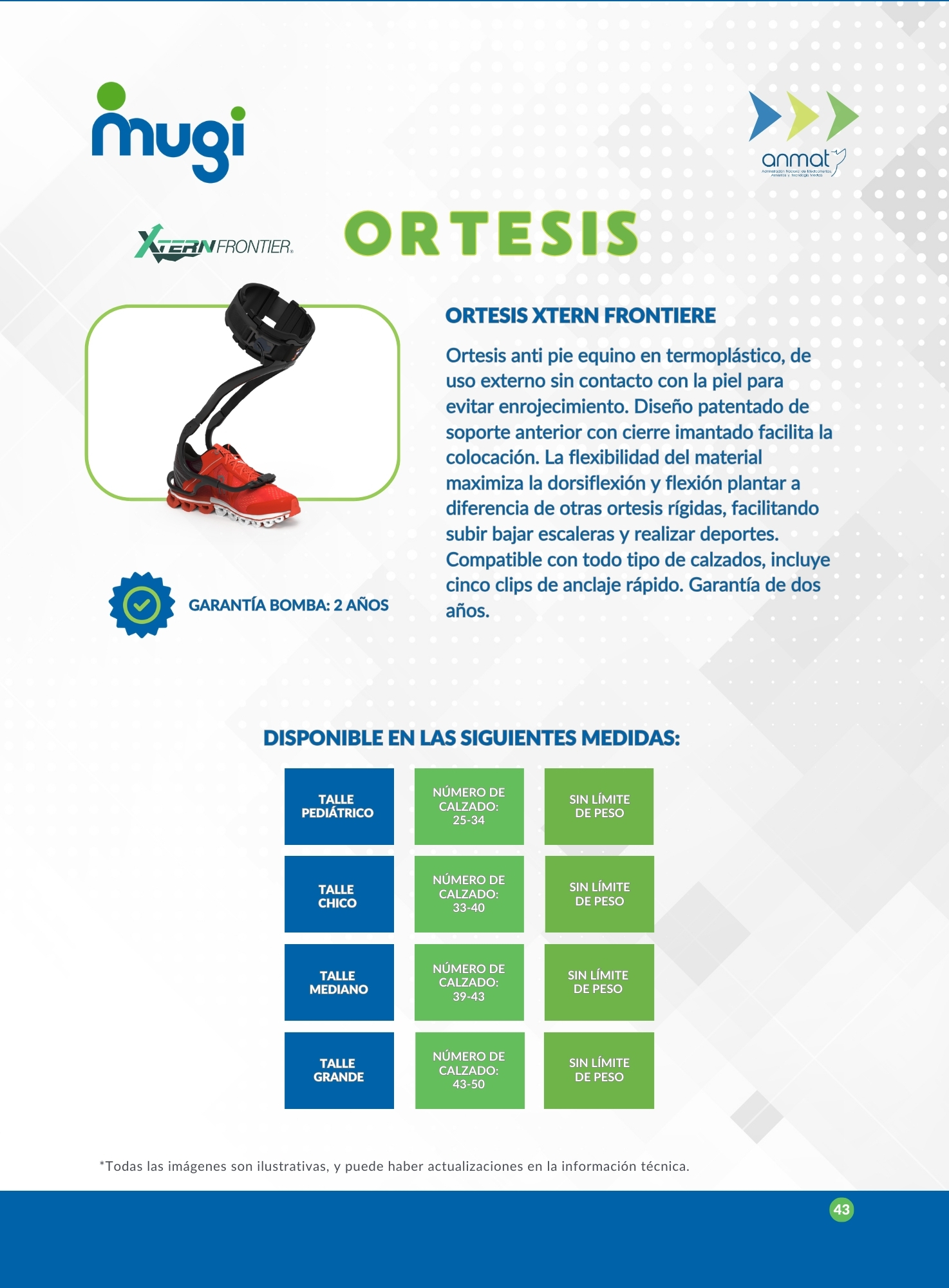 Ortesis anti pie equino en termoplástico, de uso externo sin contacto con la piel para evitar enrojecimiento. Diseño patentado de soporte anterior con cierre imantado facilita la colocación. La flexibilidad del material maximiza la dorsiflexión y flexión plantar a diferencia de otras ortesis rígidas, facilitando subir bajar escaleras y realizar deportes. Compatible con todo tipo de calzados, incluye cinco clips de anclaje rápido. Garantía de dos años.