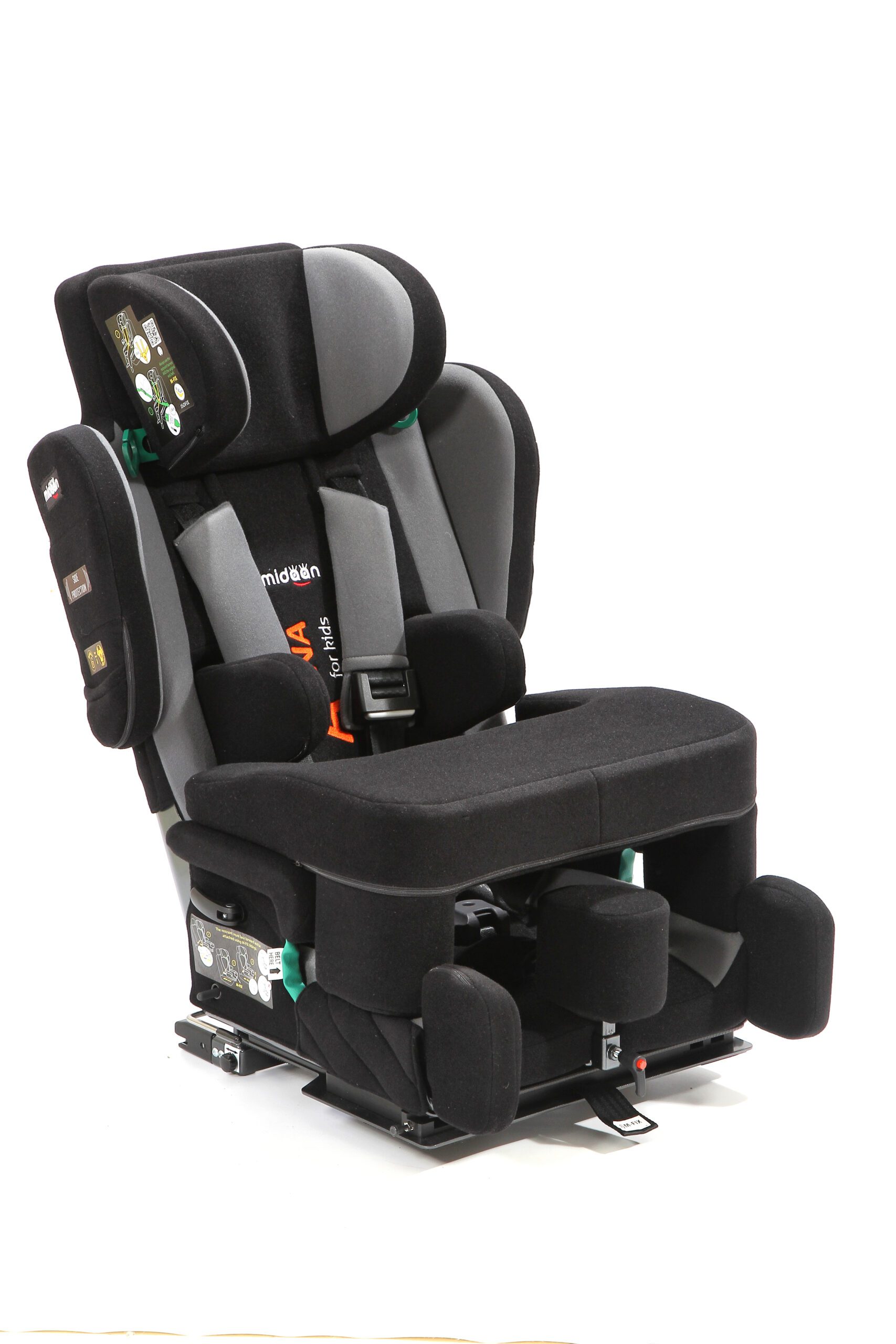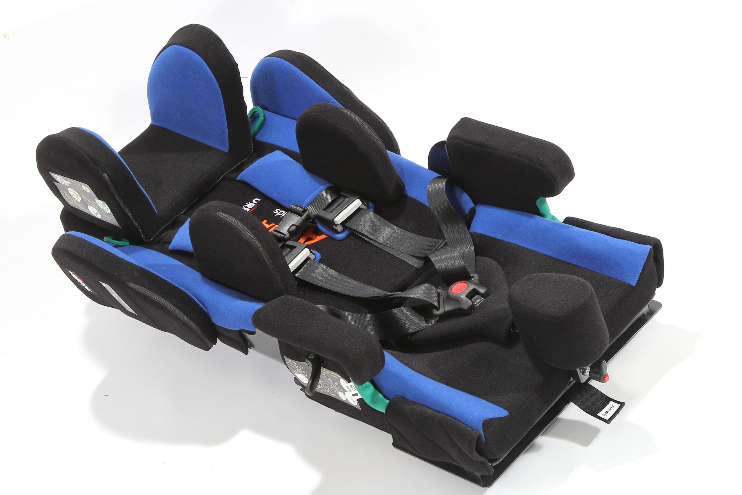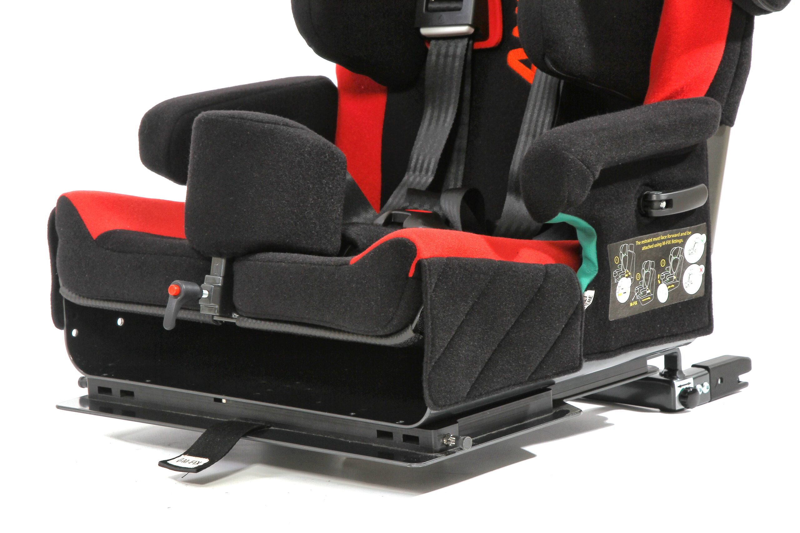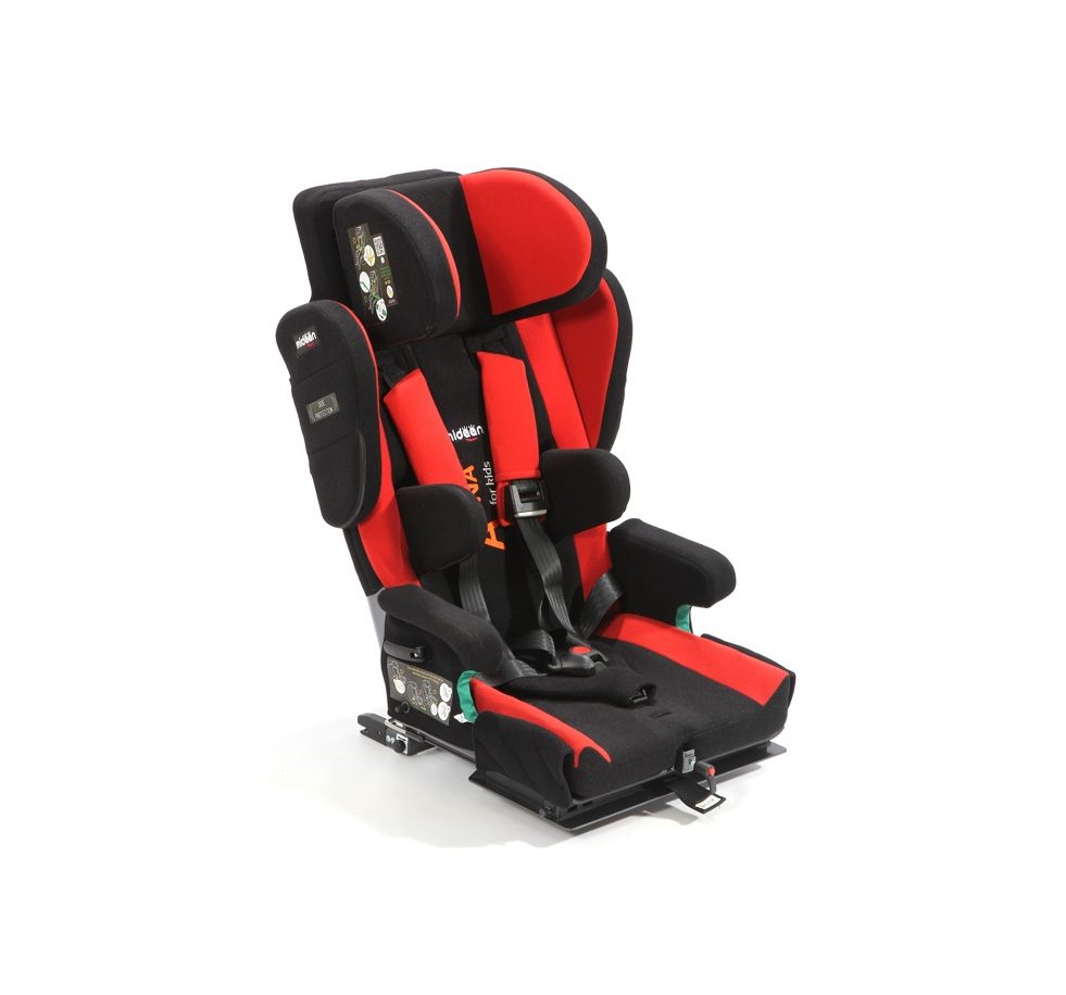 Butaca de transporte en vehículos para usuarios con necesidades especiales de posicionamiento y sujeción. Sistema robusto y seguro con arnés de 5 puntos acolchado en zonas de presión. Apoyacabeza profundo para contención lateral. Apoyabrazos acolchados tanto superior como lateralmente. Respaldo con reclinación regulable de 90° a 180°. Sistema M-Fix para despalzar la butaca hacia adelante y hacia atrás. Sistema ISO-FIX para sujeción de butaca al vehículo de forma segura. Controles laterales de tronco regulables en altura y ancho. Base giratoria para facilitar ingreso y egreso al vehículo. Arnés de 5 puntos para sujeción. Aprobada según normas de seguridad ECE R129.
