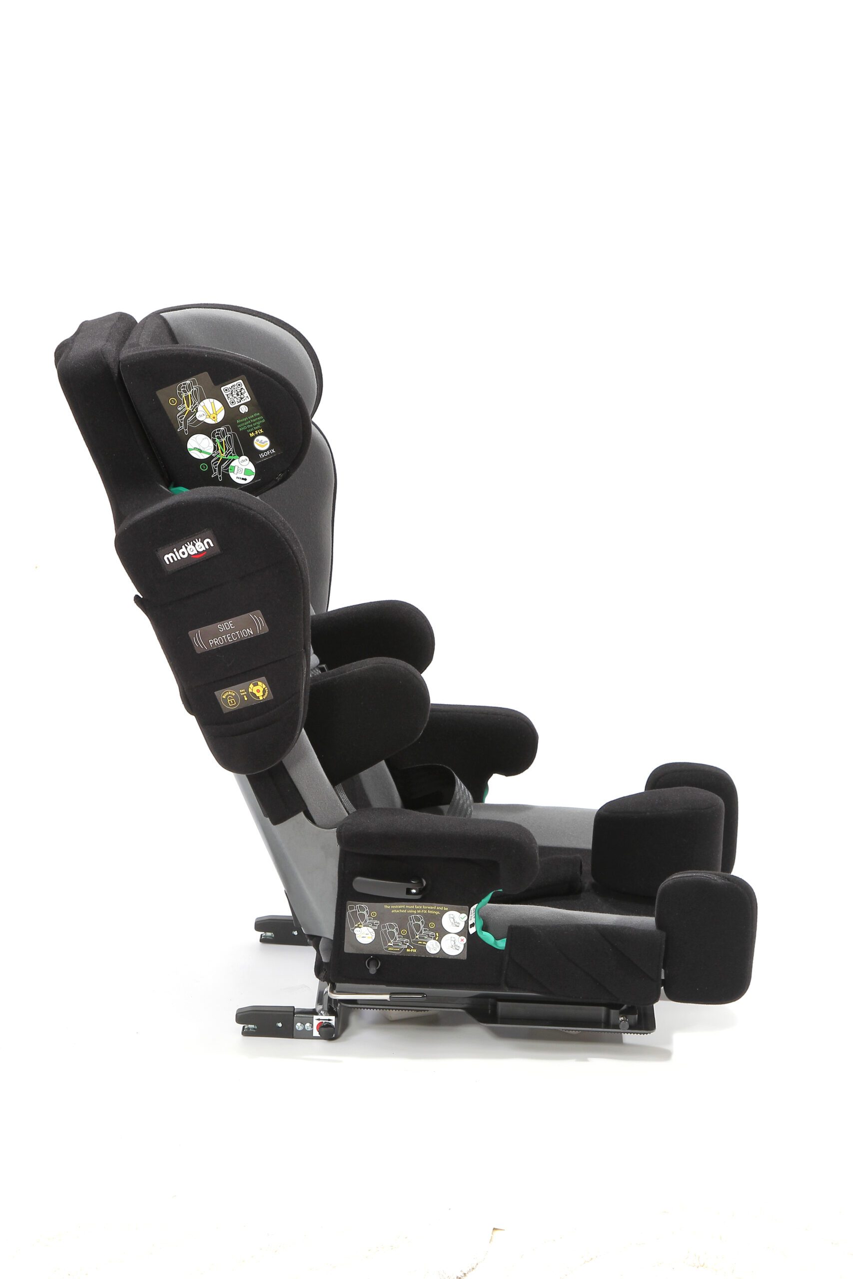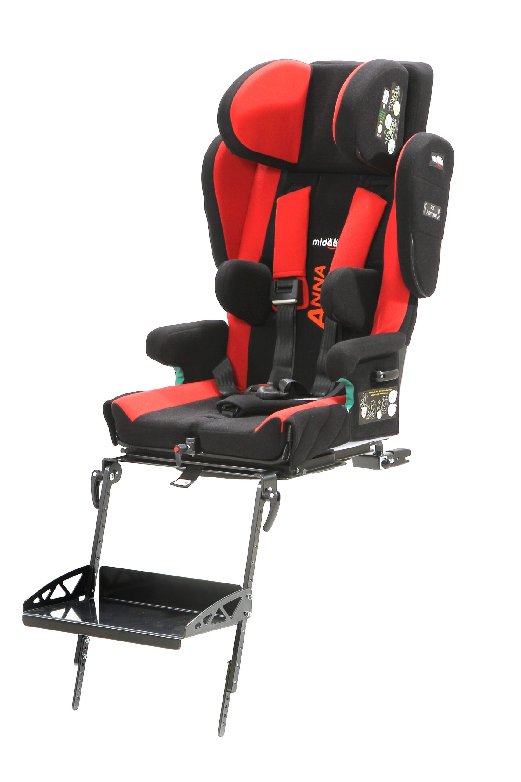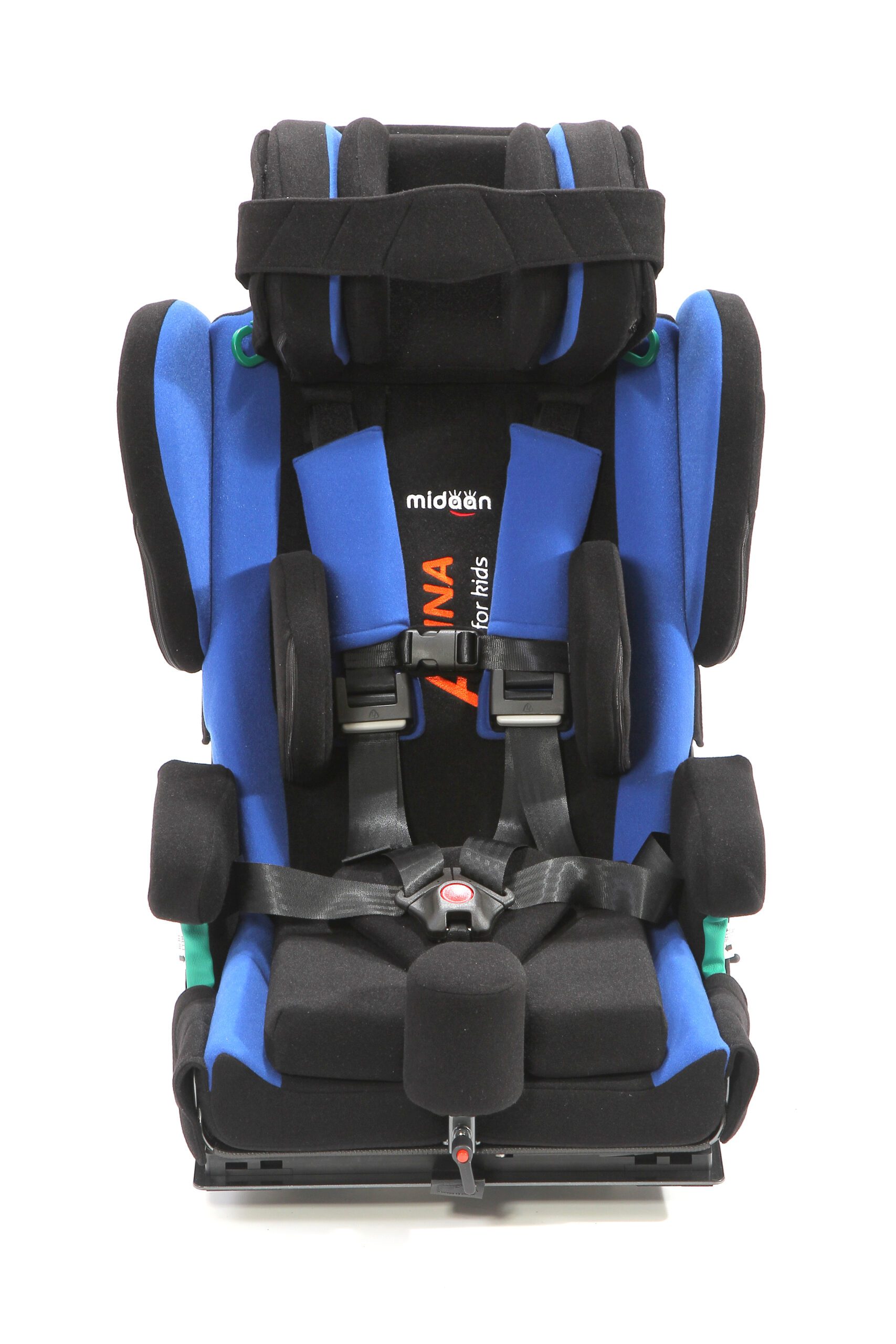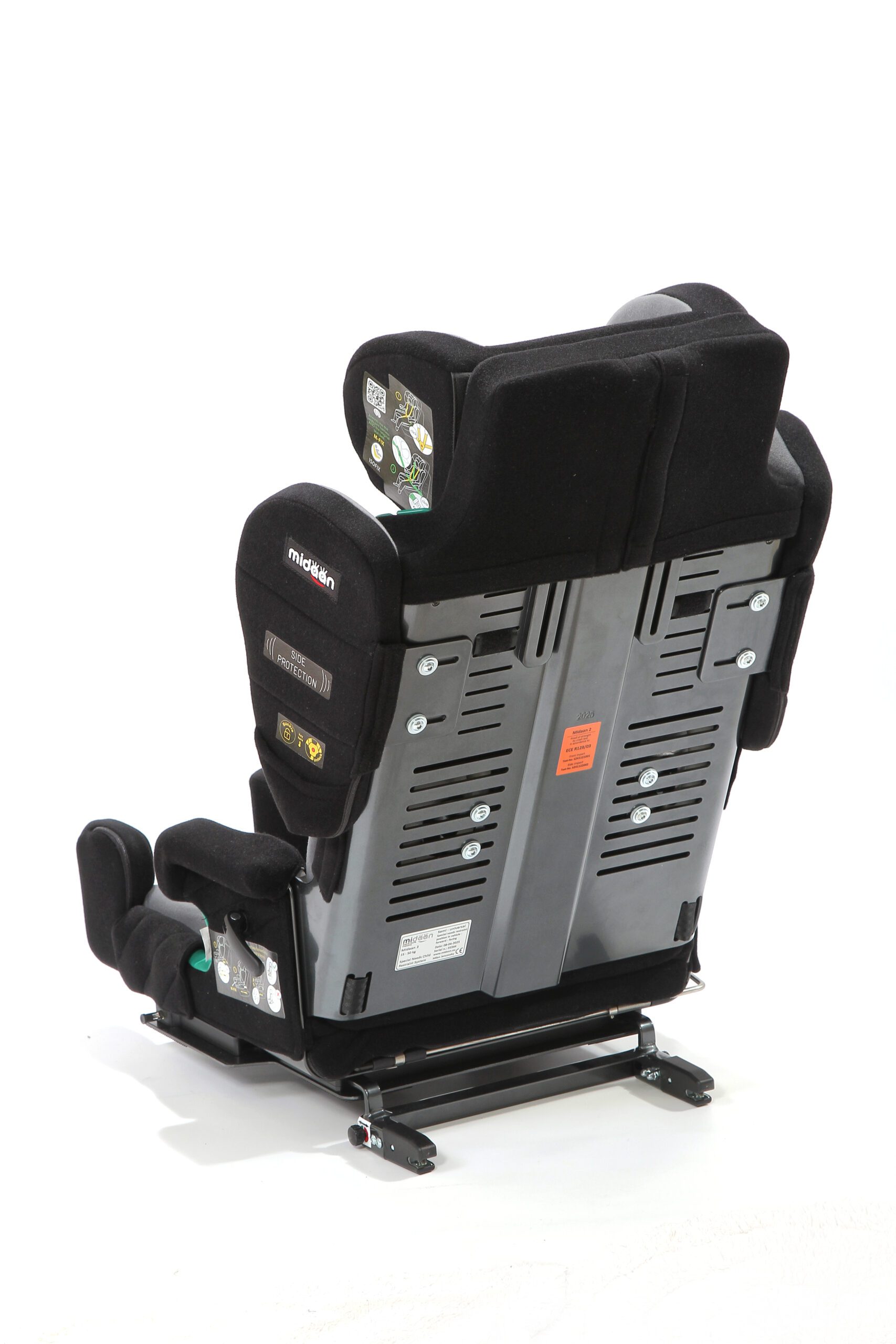 Butaca de transporte en vehículos para usuarios con necesidades especiales de posicionamiento y sujeción. Sistema robusto y seguro con arnés de 5 puntos acolchado en zonas de presión. Apoyacabeza profundo para contención lateral. Apoyabrazos acolchados tanto superior como lateralmente. Respaldo con reclinación regulable de 90° a 180°. Sistema M-Fix para despalzar la butaca hacia adelante y hacia atrás. Sistema ISO-FIX para sujeción de butaca al vehículo de forma segura. Controles laterales de tronco regulables en altura y ancho. Base giratoria para facilitar ingreso y egreso al vehículo. Arnés de 5 puntos para sujeción. Aprobada según normas de seguridad ECE R129.