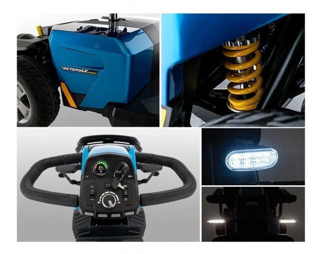 Scooter Motorizado de 4 ruedas para uso intenso por exteriores con Amortiguacion CTS en las 4 ruedas. Asiento alto con reclinacion y apoya cabeza. Neumaticos traseros y delanteros de 25 x 9 cm. Velocidad 13 km/h. Baterias 50 Amperes. Autonomia 30 km. Peso Maximo del Usuario 180 kg