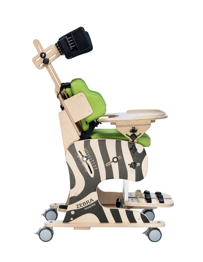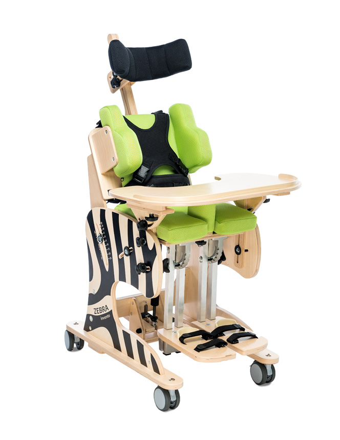 Silla de madera multilaminada Zebra equipada con cuatro ruedascon frenos. Unidad de asiento y respaldo con sistema Tilt mediante pistón neumático.Apoyacabeza ajustable en altura y profundidad con almohadilla de apoyo comfortable,articulada y variable en diámetro. Respaldo con soportes laterales y reclinable de90 a 180 grados. Soporte anterior de tronco de doble elasticidad con hebillasinferiores giratorias. Cinturón pélvico de 2 puntos con hebilla botón y regulador cinchmount. Asiento con base Foam confortable. Abductor extraíble. Apoyapiesregulables sobre el bastidor de aluminio en forma independiente, ajuste en elevaciónmediante clamp rotativo. Apoyabrazos regulables en altura e inclinación. Mesaregulable en altura e inclinación.
