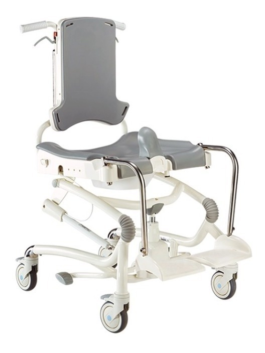 Silla de WC y ban~o. Chasis de aluminio EN AW 6060 con topes de seguridad en las ruedas. Asiento basculante y reclinacio´n de respaldo. Apoyabrazos rebatibles. Apoyapies individuales, regulables en altura e inclinacio´n, rebatibles y desmontables. Chasis regulable en altura a través de un pistón hidráulico de accionamiento a pedal para utilizar sobre el inodoro o la ban~adera. Laterales de tronco rebatibles acolchados para un control moderado. Laterales de cadera fijos desmontables, regulables en ancho.