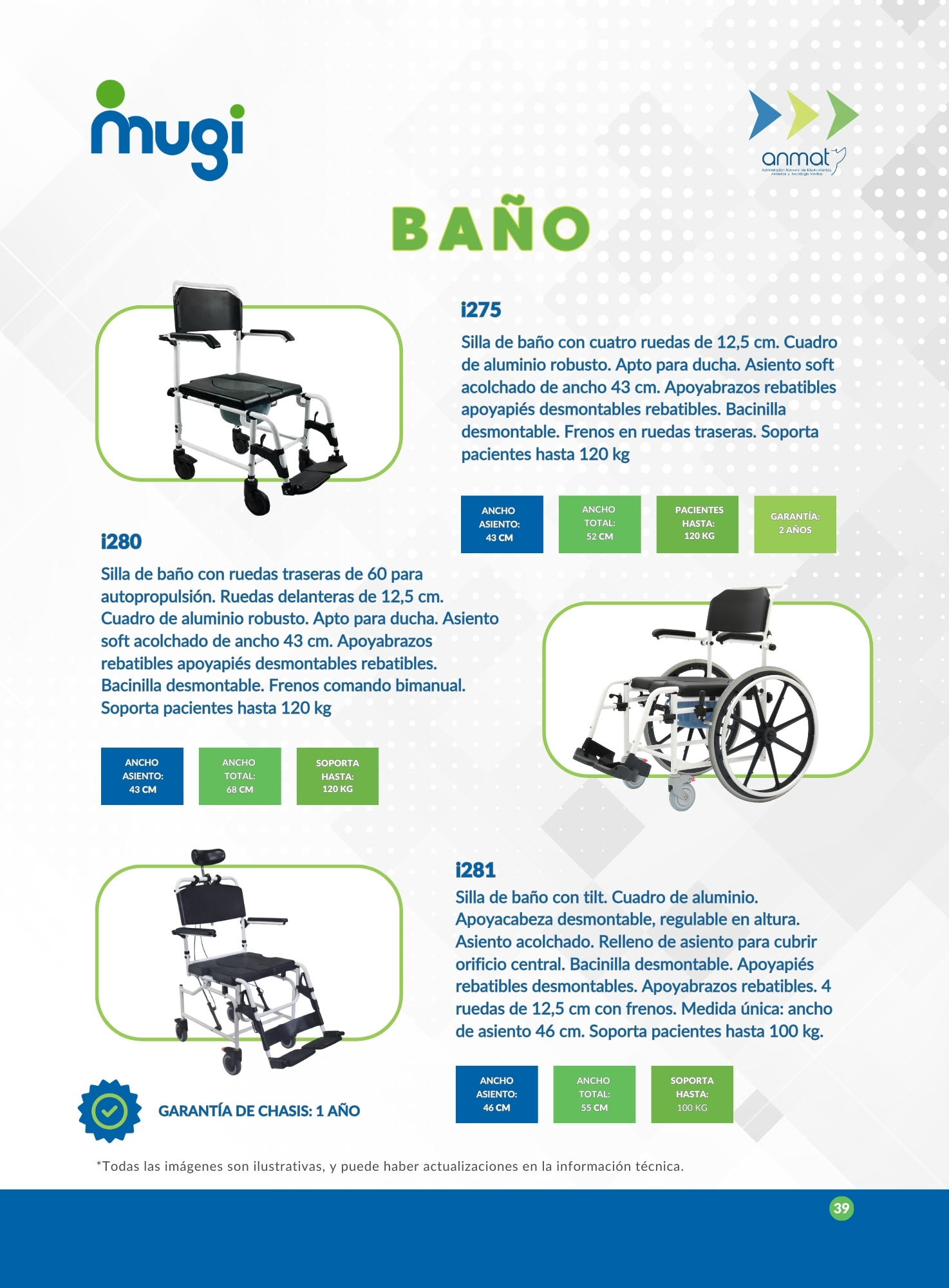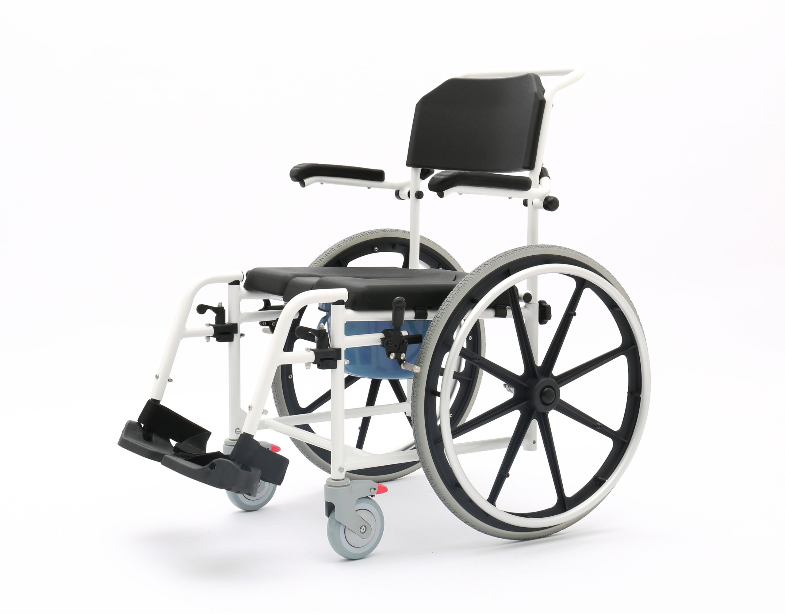 Silla de baño con ruedas traseras de 60 para autopropulsión. Ruedas delanteras de 12,5 cm. Cuadro de aluminio robusto. Apto para ducha. Asiento soft acolchado de ancho 43 cm. Apoyabrazos rebatibles apoyapiés desmontables rebatibles. Bacinilla desmontable. Frenos comando bimanual. Soporta pacientes hasta 120 kg
