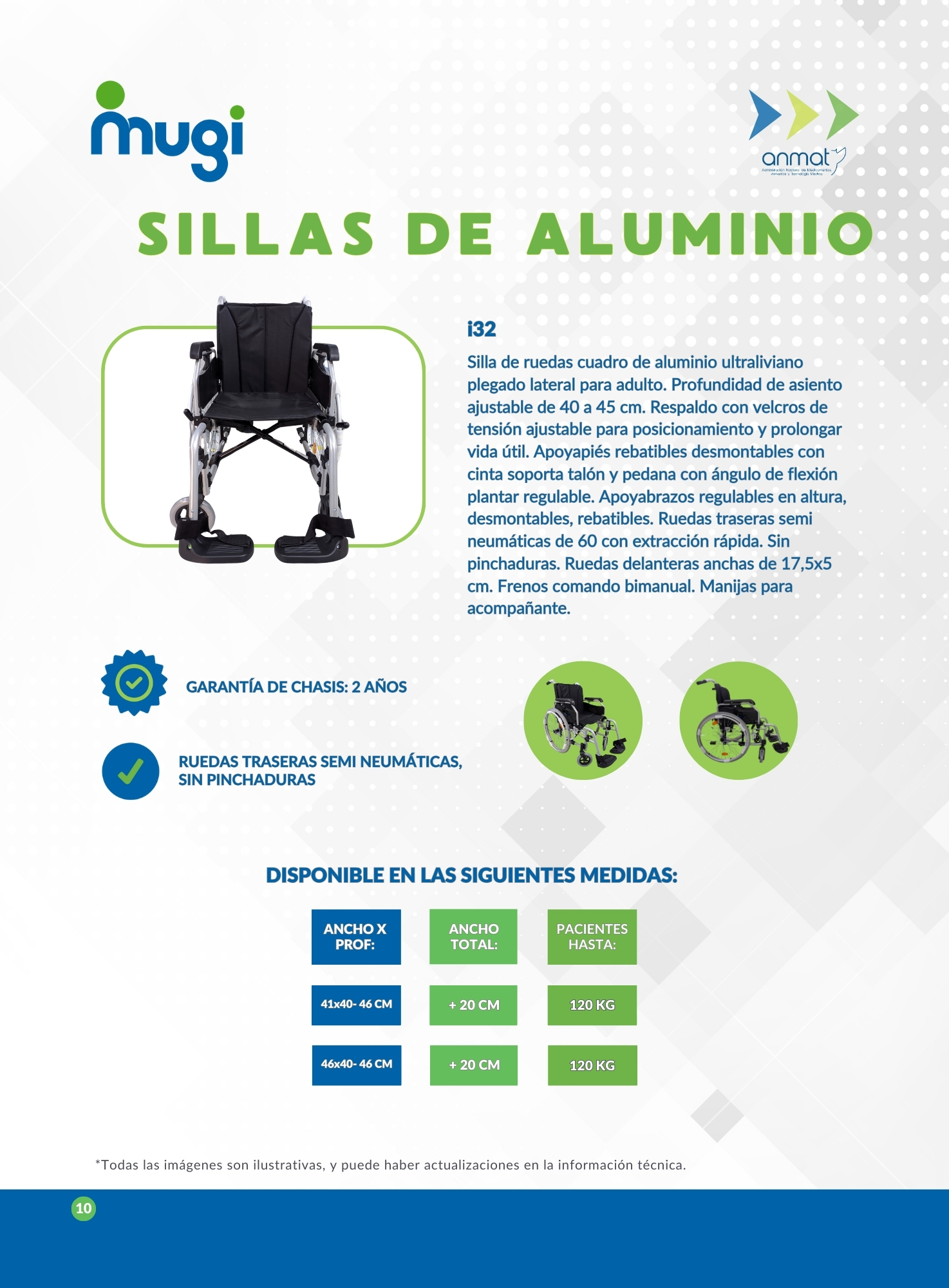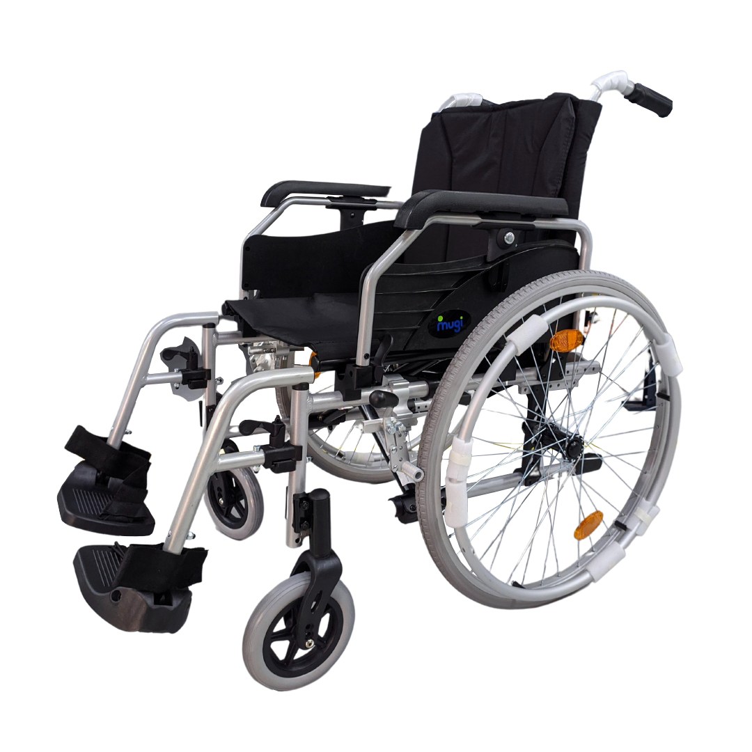 Silla de ruedas cuadro de aluminio ultraliviano plegado lateral para adulto. Profundidad de asiento ajustable de 40 a 45 cm. Respaldo con velcros de tensión ajustable para posicionamiento y prolongar vida útil. Apoyapiés rebatibles desmontables con cinta soporta talón y pedana con ángulo de flexión plantar regulable. Apoyabrazos regulables en altura, desmontables, rebatibles. Ruedas traseras semi neumáticas de 60 con extracción rápida. Sin pinchaduras. Ruedas delanteras anchas de 17,5×5 cm. Frenos comando bimanual. Manijas para acompañante. Soporta pacientes de hasta 120 kg
