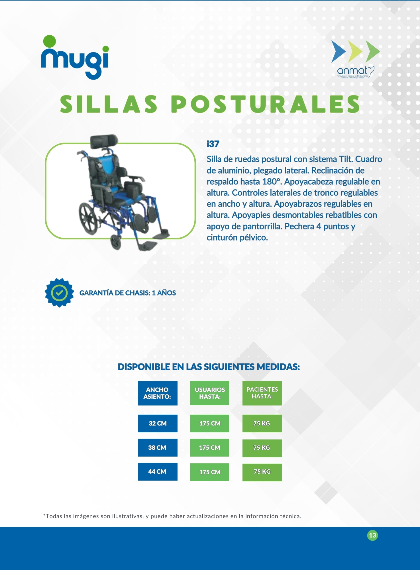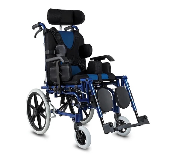 Silla postural de aluminio. Chasis con basculación (TILT). Apoyabrazos regulables en altura, desmontables. Apoya pies regulables, rebatibles y elevables. Asiento regulable en profundidad: 35-37 cm. Respaldo reclinable y regulable en altura. Apoyacabeza desmontable con múltiples regulaciones. Cinturón de seguridad para tórax y piernas. Cubiertas traseras polyaire de 38 cm. Cubiertas delanteras macizas de 15 cm. Peso máximo del usuario: 75 kg.