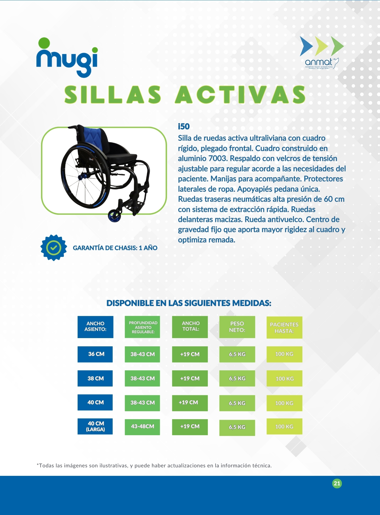 Silla De Ruedas Activa Ultraliviana Cuadro Rigido Plegado Frontal. Cuadro Construido En Aluminio 7003. Respaldo Con Velcros De Tensión Ajustable Para Regular Acorde A Las Necesidades Del Paciente. Manijas Para Acompañante. Protectores Laterales De Ropa. Apoyapies Pedana Única. Ruedas Traseras Neumaticas Alta Presion De 60 Cm Con Sistema De Extraccion Rapida. Ruedas Delanteras Macizas. Rueda Antivuelco. Centro De Gravedad Fijo Que Aporta Mayor Rigidez Al Cuadro Y Optimiza Remada. Soporta Pacientes Hasta 100 Kg.