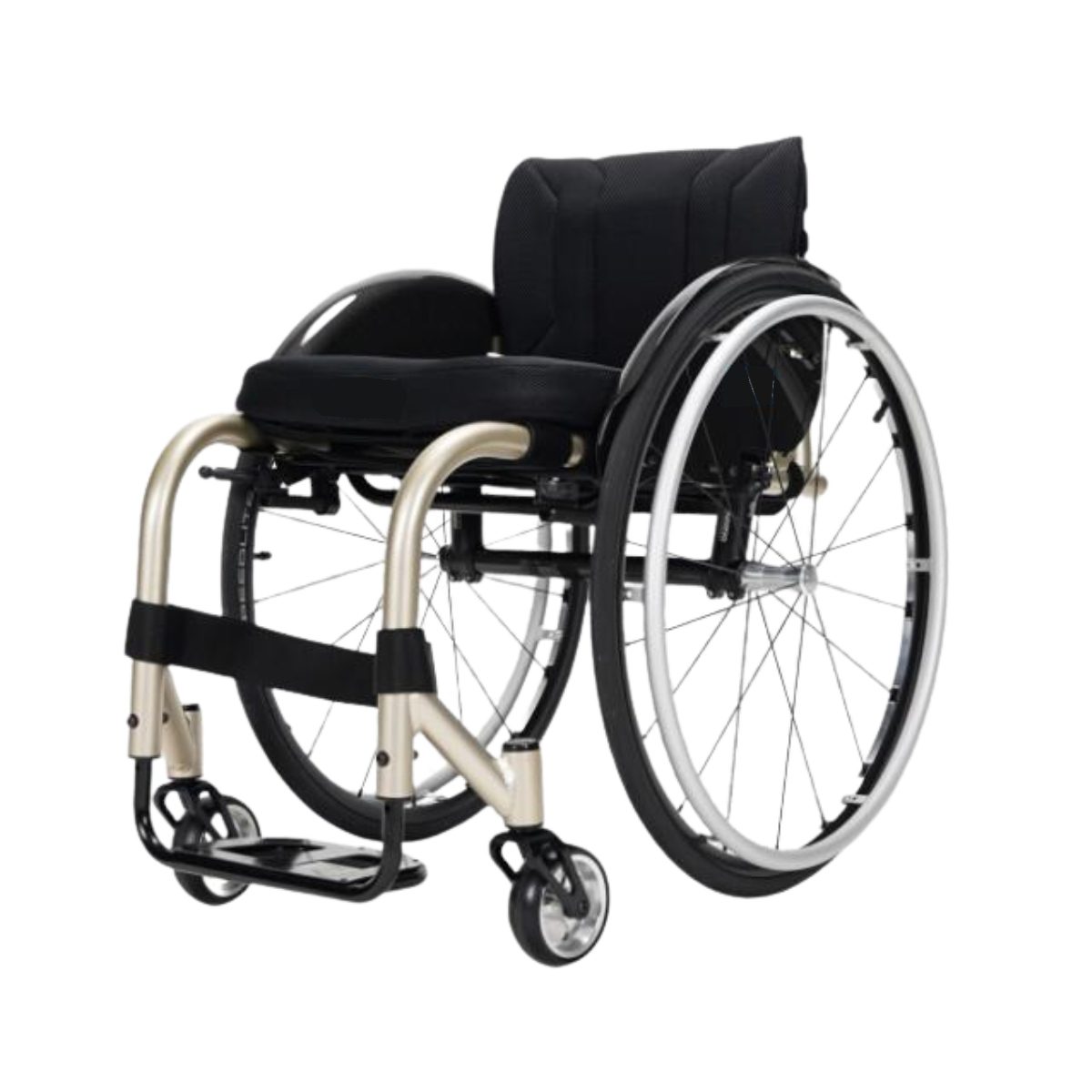 Silla de ruedas activa ultraliviana cuadro rígido. Cuadro construido en magnesio. Respaldo fijo aporta rigidez, reduce el peso total, con velcros de tensión ajustable para regular acorde a las necesidades del paciente. Eje central de ruedas, protectores laterales de ropa y pedana construídos en fibra de carbono para reducir peso y aportar rigidez. Apoyapiés pedana única. Ruedas traseras ultralivianas neumáticas de alta presión de 60 cm con sistema de extracción rápida. Ruedas delanteras macizas. Centro de gravedad regulable para configurar de forma más activa y optimizar remada. Soporta pacientes hasta 100 kg. Peso neto 5,5 kg.
