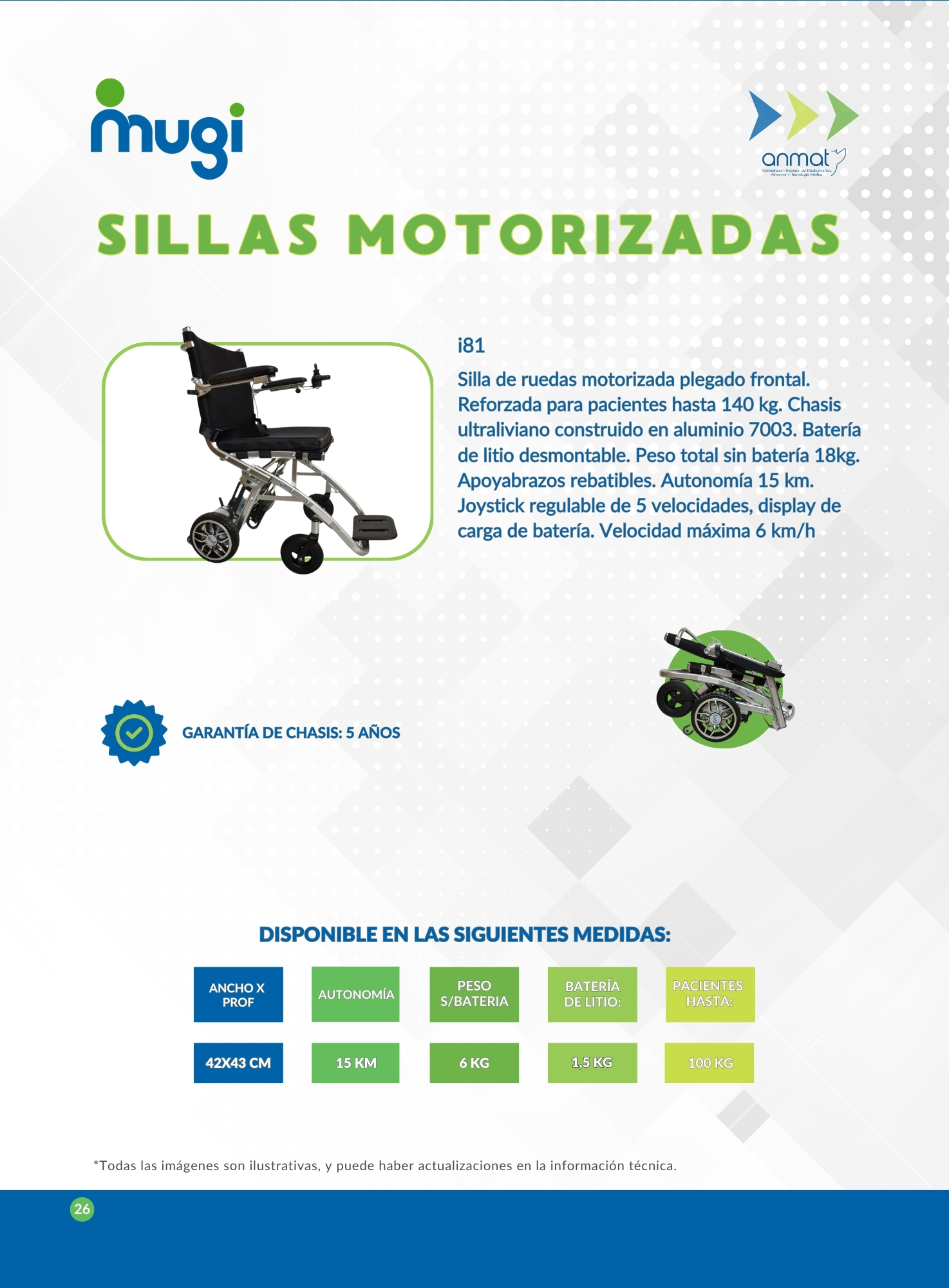 Silla De Ruedas Motorizada Plegado Frontal. Chasis Ultraliviano Construido En Aluminio 7003. Batería De Litio Desmontable. Peso Total Sin Batería 18Kg. Apoyabrazos Rebatibles. Autonomía 15 Km. Joystick Regulable De 5 Velocidades, Display De Carga De Batería. Velocidad Maxima 6 Km/H