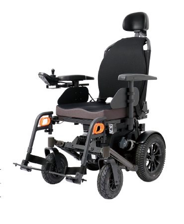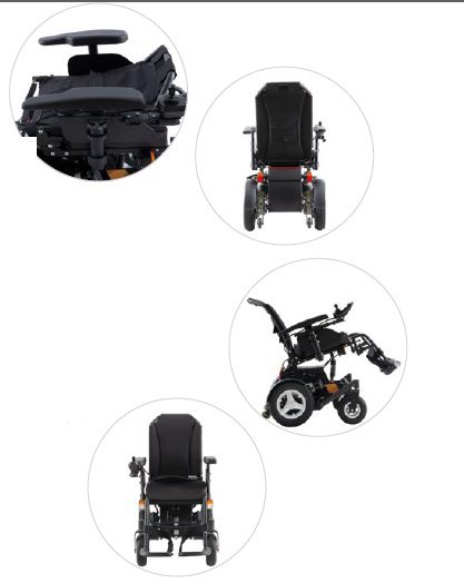 Silla de ruedas motorizada tracción trasera. Cuadro rígido robusto para exteriores, con tilt motorizado 25°. Reclinación manual en 4 posiciones hasta 120°. Apoyabrazos regulables en altura, desmontables. Ruedas traseras de 14´´, delanteras de 9´´. Joystick intercambiable en lado izquierdo o derecho. Apoyapies con pedana de aluminio, desmontables rebatibles. Velocidad máxima 10 km/h. Motores 24v 2×350 W. Dos baterías de gel ciclo profundo 12v x 50 Ah. Pack de luces incorporado. Peso con baterías incluídas 97 kg. Sistema de amortiguación. Soporta pacientes hasta 150 kg. Autonomía 35 km.